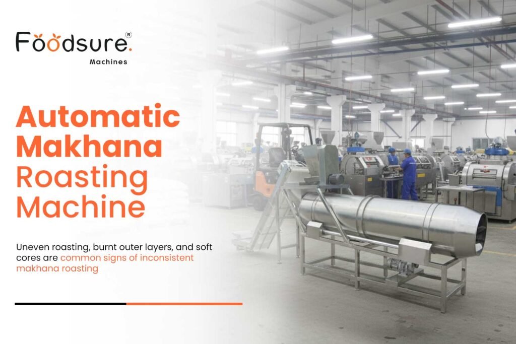 Roasted makhana demand is exploding worldwide, growing at 12%+ CAGR, and Indian manufacturers are scrambling to keep up. But here’s the real challenge, how do you scale output without burning batches, losing crunch, or wasting fuel? The answer starts with choosing the right Industrial Makhana Roasting Machine. In this guide, you’ll discover the 5 features that actually impact output, quality, and ROI. Plus how Foodsure Machines helps processors move from inconsistent manual roasting to stable, high-profit production. The #1 Reason Most Makhana Batches Fail: Poor Temperature Control Based on 45+ real installations, temperature fluctuations remain the #1 cause of rejected makhana batches. The makhana roasting temperature control system is the single most important factor in makhana processing. Unlike other nuts, makhana seeds are extremely sensitive to heat; if the temperature remains too low, they will stay chewy and raw from inside, and if it is too high, they will burn quickly, resulting in bitter flavors and a loss of nutrients. Client in Bihar increased output from 120 kg/day to 360 kg/day using our high-capacity roaster. Why Precise Temperature Control Matters in Industrial Makhana Roasting Maintaining quality is important: Makhana must be roasted at an optimal range of 140°C to 160°C, depending on the size, moisture content, and roasting style. Even a 5-10°C change in temperature can impact crunch, color, and shelf life. Even a 7°C spike can burn 20% of a batch. Uniform Roasting: Manual or semi-automated roasted makhana machines often create uneven heat distribution. This results in some batches being under-roasted while others get over-roasted. Reduction of Nutritional Value: Over-roasting can destroy essential amino acids and antioxidants found in Makhana. With proper temperature control, the protein content (around 9.7g/100g) and micronutrients are better preserved. How High-Capacity Roasters Can 3X Your Makhana Output Instantly Any Makhana manufacturer needs a high-capacity feature in their roasting machines to increase productivity. A high-capacity industrial Makhana roasting machine allows you to handle 80-100 kg/ 30 Minutes, compared to just 5-10 kg with traditional models. This also helps in the uninterrupted operation of Makhana. Upgrading to high-capacity roasters cut roasting time from 4 hours to 1 hour for most Foodsure Machines clients. Why Choosing a High-Capacity Makhana Roaster Drives Higher Output More output in less time- High capacity makhana roaster machine produces 80-100 kg/ 30 minutes, allowing multiple batches to meet daily targets. It guarantees to triple the production of makhana than manual labour, without extending the working hours. Continuous roasting- Our conveyor-based systems support continuous input and output of makhana, reducing the downtime between batches. This means fewer starts and stops, no cooling delays, and smooth integration with flavoring, sorting, or packaging lines. Low labour and energy costs- Higher capacity means fewer cycles and less manual handling. One operator can manage a larger volume, reducing the need for extra labor. Plus, roasting more per batch improves energy efficiency in comparison to small-batch systems. Read More: High-Capacity vs. Small-Scale Makhana Machines Cheap Roasters Fail Fast – Here’s Why Food-Grade Machines Last 10+ Years Our machines’ contact parts are constructed with Stainless Steel 304 16 Gauge, Thickness 18 to 20 mm, and non-contact parts are of Stainless Steel 202, renowned for its corrosion resistance, ease of cleaning, and compliance with global food safety standards. This powerful material ensures the machine withstands continuous operation and harsh cleaning protocols, delivering years of reliable service. Why Food-Grade Construction Matters In Makhana Roasting Machines? Increased Sanitation and Hygiene- SS 304 is designed to prevent the buildup of bacteria and pathogens. Smooth, non-porous surfaces make cleaning and sanitization necessary, which is critical for maintaining the strict hygiene standards required in food processing environments. Operational efficiency- Food grade construction in makhana making machine also eases maintenance and cleaning, minimizing production downtime and increasing overall production. SS 304 material machines maintain uninterrupted operations and consistent product quality. Regulatory Compliance- Using food-grade materials ensures compliance with global food safety regulations, such as FDA, 3-A, and ASME BPE standards. This compliance is not just about avoiding legal issues; it’s about guaranteeing that your makhana roasting process consistently meets the highest safety benchmarks, protecting your business from costly recalls and reputational damage. Slash Your Roasting Cost Per Kg: Energy-Efficient Machines Explained Inefficient roasters can burn ₹18–30 per kg in energy losses alone. Energy efficiency and cost-effectiveness are important features when choosing an makhana processing unit, as they directly impact your bottom line and operational sustainability. Our machines are engineered to deliver high roasting output while minimizing power consumption, making them a smart investment for any scale of operation. Why should machines be energy-efficient and cost-friendly? Lower Operating costs- Energy-efficient machines reduce electricity and fuel consumption, which can account for a major portion of a food processor’s expenses. By optimizing energy usage, businesses can achieve substantial cost savings, freeing up capital for growth or innovation. Increased Profitability- Lower energy bills directly increase profit margins. When machines use less power to achieve the same or better results, the cost per unit of makhana processed decreases, making your operation more competitive in the market. Environment saving- Energy-efficient equipment helps reduce greenhouse gas emissions and the overall carbon footprint of your facility. This not only supp
